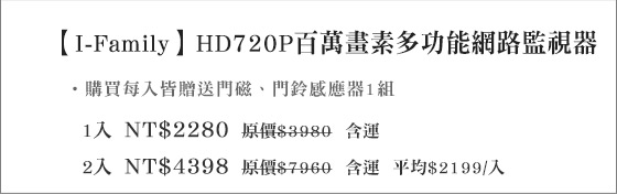 商品訊息簡述: 平均每入最低只要2199元起(含運)即可購得【I-Family】HD720P百萬畫素多功能網路監視器1入/2入,每入皆贈送門磁、門鈴感應器一組!